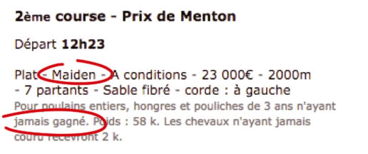 Hormis le cas des courses “maiden” qui sont identifiées comme telles, avec la mention “pour chevaux n’ayant jamais gagné”, vous devez ruser pour identifier un “maiden”, car la “musique” s’avère insuffisante : parfois elle affiche seulement les 4 ou 5 résultats les plus récents…