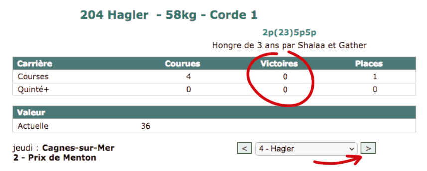 - examinez l’information la plus précieuse : le cheval doit avoir “0” victoire ! Sur cet exemple Hagler est bien “maiden”, avec zéro victoire,